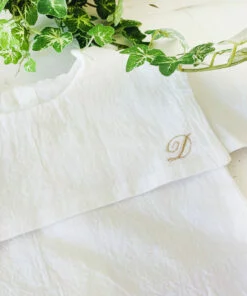 Camasa este croita si cusuta manual din panza topita de bumbac 100%. Poarta mandra pe gulerul de marinar o broderie delicata cu initialele numelui.