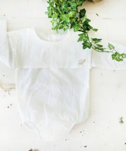 Camasa este croita si cusuta manual din panza topita de bumbac 100%. Poarta mandra pe gulerul de marinar o broderie delicata cu initialele numelui.