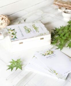 Cutia in forma de carte este din lemn, are 20x24x8cm si este infrumusetata prin tehnica decoupage-ului apoi decorata cu vopsele acrilice si antichizata. Este personalizata cu initiala dorita si cu data evenimentului, iar textul poate fi modificat.