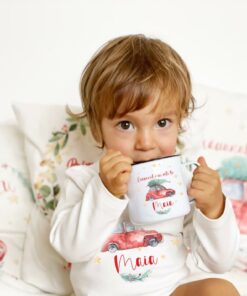 Setul contine o cutie de lemn (20/30/15 cm) personalizata, o canuta din email personalizata si un ornment asortat de asemenea personalizat. Setul include si un body din bumbac cu maneca lunga personalizat.