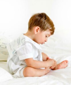 Costumas bebe din bumbac Pestisorii Veseli este croit si cusut manual din bumbac 100% topit, moale si fin. Material 100% realizat in Romania. Tesatura este fina si moale, potrivita pentru pielea delicatat a bebelusilor.