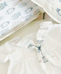 Costumasul poarta mandru un guler vintage, patratos, ca un marinar adevarat. Gulerul este plin de pestisori adorabili printati direct pe bumbac in atelierul nostru. Este ideal pentru zilele calduroase si insorite.
