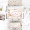 Cutia combina elementele magice ale copilariei, in nuante calde si placute de roz si bleu, cu cea nau delicate lebada si elemente florale, toate in accente watercolor Aduce veselia tuturor si face parte din colectia de cele mai frumoase cadouri pentru pitica ta!