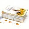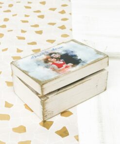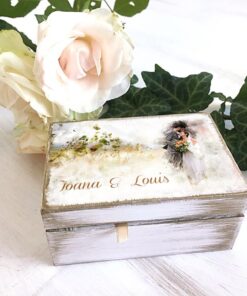 Lucrata prin tehnica decoupage-ului, apoi pictata si antichizata cu vopsele acrilice, cutia este din lemn si are 11×7.5x5cm. Este personalizata cu nume si foto pe capac exterior iar la interior putem scrie orice mesaj doresti, precum We Do sau Forever. Cutiuta are o pernuta lucrata manual din bumbac (culoarea poate sa difere intre alb si bej) si o panglicuta pe care sa prinzi inelele.
