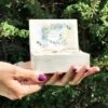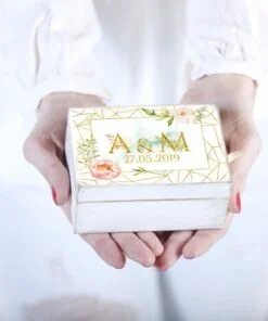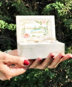 Lucrata prin tehnica decoupage-ului, apoi antichizata cu vopsele acrilice, cutia este din lemn si are 11×7.5x5cm. Este personalizata cu initiale si data pe capac (are un design asemanator si inauntru), iar la interior putem scrie orice mesaj doresti, precum We Do sau Forever.