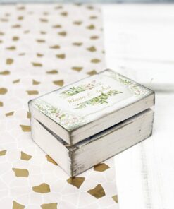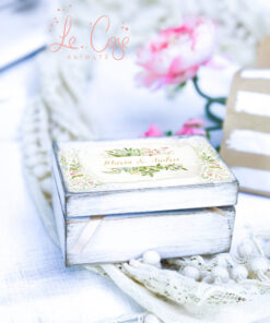 Lucrata prin tehnica decoupage-ului, apoi pictata si antichizata cu vopsele acrilice, cutia este din lemn si are 11×7.5x5cm. Este personalizata cu nume si data sau putem scrie orice mesaj doresti. Ca de exemplu We Do sau Forever. Cutiuta are o pernuta lucrata manual din bumbac (culoarea poate sa difere intre alb si bej) si o panglicuta pe care sa prinzi inelele.