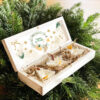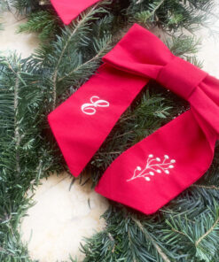 Ornamentul personalizat este realizat din bumbac și in, sub  forma de funda adorabila. O latura a panglicii este personalizata prin broderie cu o rămurică de vâsc iar cealaltă latura cu inițiala numelui ales de tine.