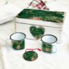 Setul contine o cutie de lemn (20/30/15 cm) personalizata, doua canute din email personalizate si un ornment asortat de asemenea personalizat.