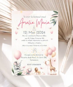 Aceste Invitatii Botez Animale Jungla si Baloane Roz sunt alegerea perfectă pentru a anunța botezul micuțului dvs. într-un mod original și memorabil. Vă invităm să aduceți un strop de bucurie și culoare în acest moment unic din viața familiei dvs. cu aceste invitații minunate.
