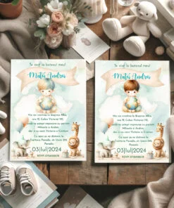 - Design Personalizat: Fiecare invitație este o mică operă de artă, in centrul designului, un copil adorabil ține în brațe un glob pământesc. simbolizând curiozitatea și mirarea față de lumea vastă și minunată în care tocmai a pășit. Elementele însoțitoare – un elefant jucaus, o girafă prietenoasă și un leu blând, toate alături de baloane colorate și o porțiune din harta lumii în stil acuarelă – adaugă o notă de veselie și aventură.