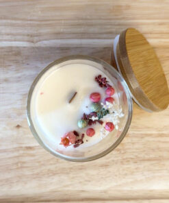 Lumanarea noastră de soia este turnată într-un recipient de sticla transparenta de 200ml și este înfrumusețată cu floricele naturale uscate.