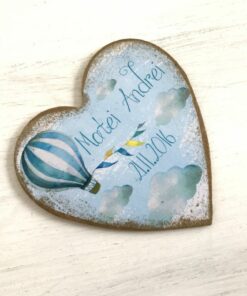 Inimioarele pot fi personalizate cu nume, data sau mesaj si sunt din mdf, au 7x7cm si 3 mm grosime. Sunt lacuite in 3 straturi pentru ca tu si invitatii tai sa va bucurati de ele ani la rand.. Decorate prin tehnica decoupage-ului, inimioarele cu baloane iti vor starni dorinta de aventura 🙂
