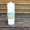 Delicata si eleganta, lumanarea are 25 de cm inaltime si poarta o panglica de dantela impreuna cu o inimioara de lemn personalizata cu numele copilasului!