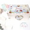 Fie ca o folosesti la botez ca guestbook, pentru a primi darul sau o umpli cu flori si o folosesti ca centerpiece. cutia iti va transforma atmosfera in ceva altfel, deosebit. Este lucrata manual de artistii Le Cose Animate. Ce este magic la ea? O poti folosi pentru a pastra amintirile de la botez sau pur si simplu pentru a tine lucrurile dragi tie. Cutia este din lemn, foarte incapatoare si este pictata cu vopsele acrilice. Apoi este infrumusetata prin tehnica decoupage-ului, apoi antichizata pentru un look old.