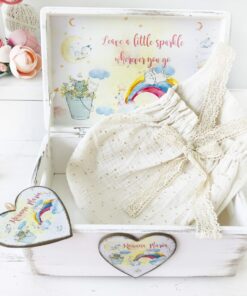 Setul contine o cutie personalizata din lemn de 20x30x15cm (poti alege orice model de cutie de pe site, aceasta este doar un exemplu) si un costumas delicat din muselina moale si fina. Tot in set vei regasi si o decoratiune din lemn personalizata:)