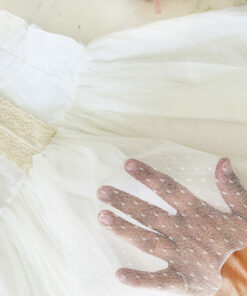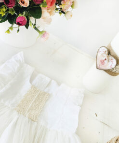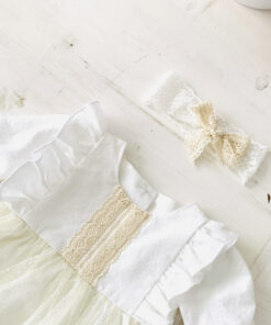 Rochita Botez de Vara Personalizata din Tul Delicat este croita si cusuta manual din cea mai usoara si fina panza topita si este infrumusetata cu poale delicate din tulle unt cu bulinute. Compozita panzei este de 100% bumbac. Rochita se inchide cu nasturei delicati pentru a nu o deranja pe micuta iar pe piept este decorata cu o delicata banda din dantela crosetata.