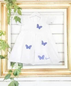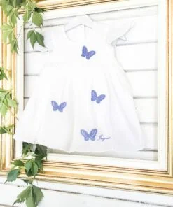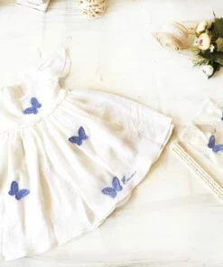 Rochita Botez Panza topita Personalizata Fluturasi Bleu este croita si cusuta manual din cea mai usoara si fina panza topita. Compozita panzei este de 100% bumbac. Rochita se inchide cu nasturei delicati pentru a nu o deranja pe micuta.