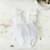 Rochita de botez poate fi personalizata cu numele micutei cu ajutorul unei broderii delicate pe sub fustita transparenta din tulle.