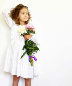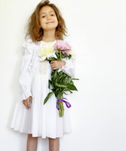 Rochita Botez Personalizata Maneca Lunga Tule  este croira si cusuta manual din cea mai usoara si fina panza topita si este infrumusetata cu poale delicate din tule unt cu bulinute. Compozita panzei este de 100% bumbac. Rochita se inchide cu nasturei delicati pentru a nu o deranja pe micuta iar pe piept este decorata cu o delicata banda din dantela crosetata.