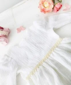 Rochita Botez Personalizata Mia este croita si cusuta manual din cea mai usoara si fina panza topita. Compozita panzei este de 100% bumbac. Rochita se inchide cu nasturei delicati pentru a nu o deranja pe micuta iar in talie este decorata cu o delicata banda din dantela crosetata.