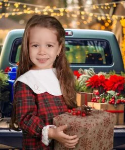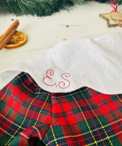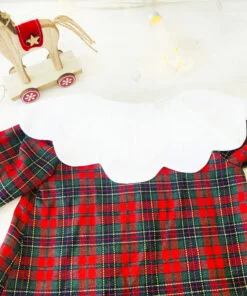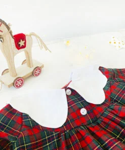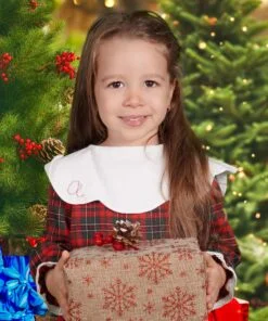 Rochita Craciun Personalizata este croita si cusuta manual din cea mai delicata stofa. Poarta mandra un guler alb ondulat ce va fi personalizat cu initiala numelui prin broderie. Rochita se inchide cu nasturei delicati pentru a nu o deranja pe micuta. Manecile si poalele sunt decorate cu broderie alba.