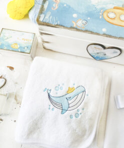 O cutie personalizata din lemn de 40x30x15cm, cu numele ales de tine, data și mesajul dorit, un prosop pufos de 80x80cm brodat cu numele ales de tine si un model asortat. .Trusoul include si panza de botez de 1x1m brodata cu numele si data, dar si o fasa brodata cu numele.