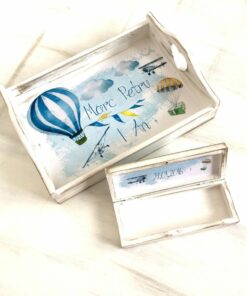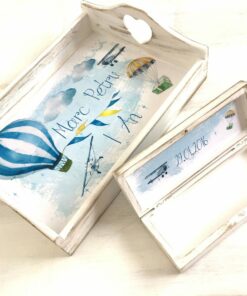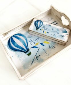 Set 1 An Baloane cu aer cald tava si cutiuta personalizate combina delicatetea baloanelor cu aer cald pictate in acuarele cu frumusetea avioanelor. Te indeamna de indata sa iti urmezi visurile si sa cauti aventuri nebanuite calatorind in lung si-n lat! Setul contine o tava pentru taierea motului si o cutiuta din lemn pentru a pastra prima suvita a copilului.