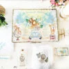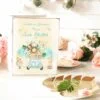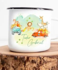 Set 1 An Bebe Safari – tava si cutiuta mot are un model delicat cu un bebe leu minunat. Designul are un fundal watercolor de poveste, cu frunze din jungla, o masinuta vintage care poarta deasupra animalute de poveste si detalii magice. Pentru visatori, iubitori de calatorii si curajosi.