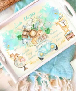 Setul este personalizat cu numele copilului, infrumusetat prin tehnica decoupage-ului si pictat cu vopsele acrilice. apoi antichizat si lacuit pentru ca tu sa te bucuri de el ani la rand. Tava (35x25x10cm) si cutiuta (20x8x4cm) sunt din lemn.