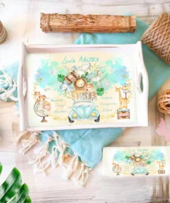Set 1 An Bebe Safari – tava si cutiuta mot are un model delicat cu un bebe leu minunat. Designul are un fundal watercolor de poveste, cu frunze din jungla, o masinuta vintage care poarta deasupra animalute de poveste si detalii magice. Pentru visatori, iubitori de calatorii si curajosi.
