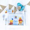 Setul este personalizat cu numele copilului, infrumusetat prin tehnica decoupage-ului si pictat cu vopsele acrilice, apoi antichizat si lacuit pentru ca tu sa te bucuri de el ani la rand. Tava (35x25x10cm) si cutiuta (20x8x4cm) sunt din lemn.