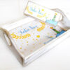 Setul pentru un an Watercolor cu delicatii trandafiri si fluturasi este creat special pentru copilasul tau. Vesel si romantic, are un fundal vintage in nuante bleu. Setul contine o tava pentru taierea motului si o cutiuta din lemn pentru a pastra prima suvita a micutului, ambele personalizate cu numele copilasului.