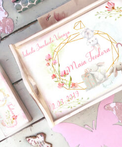 Set 1 an Iepurasul Cristal – tava taiere mot si cutiuta prima suvita personalizate combina elementele magice ale copilariei, in nuante calde si placute de turcoaz si roz, cu iepurasi delicati si elemente florale, toate in accente watercolor 🙂 Aduce veselia tuturor si face parte din colectia de cele mai frumoase cadouri pentru pitica ta! Setul contine o tava pentru taierea motului si o cutiuta din lemn pentru a pastra prima suvita a copilului.