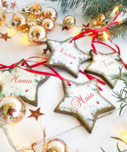 Set 3 ornamente brad Noel Mama Tata si Copilul este perfect pentru a celebra Craciunul . Contine 3 stelute personalizate cu Mama, Tata si numele copilului 🙂 Este un cadou deosebit pentru o proaspata familie. Fiecare ornament este lucrat manual.