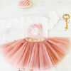 Tutu-ul este realizat din tulle dusty pink si se prinde la spate intr-o funda delicata.