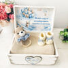 Setul contine o cutie carte personalizata din lemn de (poti alege orice model de cutie de pe site, aceasta este doar un exemplu), un iepuras de plus dodo și o perie și oglinda din lemn pentru copii, ambele personalizate.