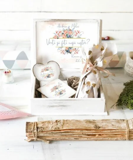 Nu uita sa specifici ce personalizare doresti inainte de a finaliza comanda (interior si exterior!). Putem face cu acelasi model mai multe produse (marturii, cutie de amintiri, invitatii, ghirlande) asa ca nu ezita sa ne contactezi pentru orice detalii.