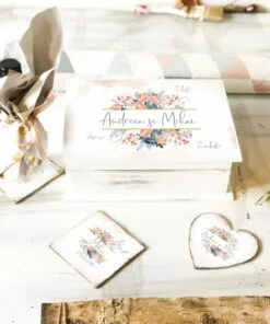 Set cadou personalizat Nasi – Coral Wed are un colaj delicat in nuante de corai, bleumarin si unt, cu flori in stil watercolor si o tusa de auriu.