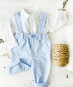 Atât camasa cât și pantalonii sunt croiți și cusuți  manual din panza topita de bumbac 100%. Un material natural, aerisit și foarte delicat cu pielea bebelușilor. Ținuta este potrivită indiferent de sezon.