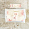 Setul este personalizat cu numele copilului, infrumusetat prin tehnica decoupage-ului si pictat cu vopsele acrilice. apoi antichizat si lacuit pentru ca tu sa te bucuri de el ani la rand. Tava (35x25x10cm) si cutiuta (20x8x4cm) sunt din lemn.