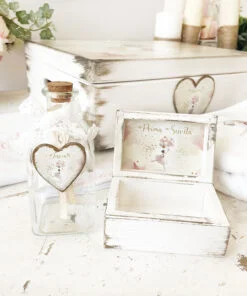 1. Cutie Personalizată din Lemn (40x30x15cm): Aceasta este personalizata cu numele ales de dumneavoastră, mesajul personalizat și data dorită, transformând-o într-o amintire prețioasă pentru anii ce vor veni.