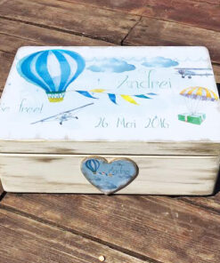 Hot Air Balloons- Trusou Botez Personalizat Baloane cu Aer Cald contine o cutie personalizata din lemn de 40x30x15cm (poti alege orice model de cutie de pe site, aceasta este doar un exemplu), un prosop pufos de 80x80cm brodat cu numele copilului si simpaticele baloane. Trusoul include si panza de botez de 1x1m brodata cu numele si data, dar si o fasa brodata cu nume . Sticluta pentru mir este personalizata cu o inimioara de lemn pe care scrie numele copilasului si are o funda din dantela care o innobileaza.