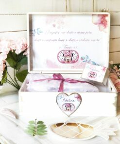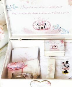 Contine o cutie personalizata din lemn de 40x30x15cm (poti alege orice model de cutie de pe site, aceasta este doar un exemplu), un prosop pufos de 80x80cm brodat cu numele lui bebe si o broderie cu indragitul soricel perfect asortata cu tema trusoului.