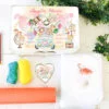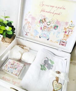 O cutie personalizata din lemn de 40x30x15cm, un prosop pufos de 80x80cm brodat cu numele si un Flamingo delicat. Trusoul include si panza de botez de 1x1m brodata cu numele, dar si o fasa brodata cu numele.