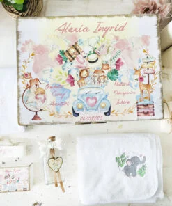 Ai ca optiuni sa completezi trusoul cu lumanarea de botez, personalizata cu numele celui mic si modelul trusoului:) dar si cu o paturica moale si delicata din bumbac personalizata prin imprimare DTG cu numele lui bebe dar si cu modelul trusoului.