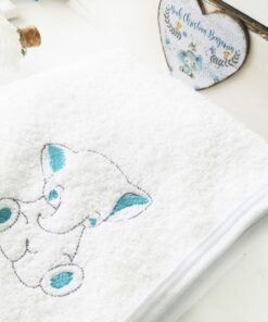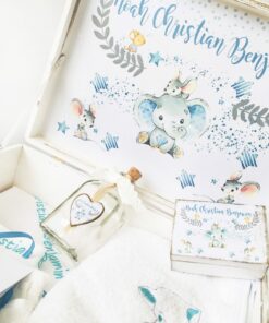 Trusoul de botez este esential pentru a transforma acest eveniment intr-o frumoasa poveste cu minunate amintiri pentru copilasul tau. Contine o cutie personalizata din lemn de 40x30x15cm (poti alege orice model de cutie de pe site, aceasta este doar un exemplu), un prosop pufos de 80x80cm brodat cu numele copilului si o broderie cu elefant simpatic.