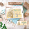 O cutie personalizata din lemn de 40x30x15cm, cu numele ales de tine, mesajul și data dorita, un prosop pufos de 80x80cm brodat cu numele ales de tine si un model asortat. .Trusoul include si panza de botez de 1x1m brodata cu numele si data, dar si o fasa brodata cu numele.
