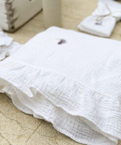 - Un prosop pufos de 90x90cm cu capison din prosop și muselină organica și cu volanase elegante din muselină. Prosopul este personalizat prin broderie cu numele ales de tine si un model asortat.