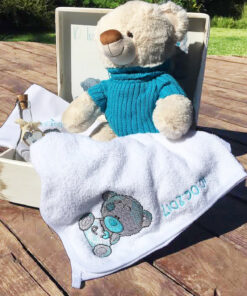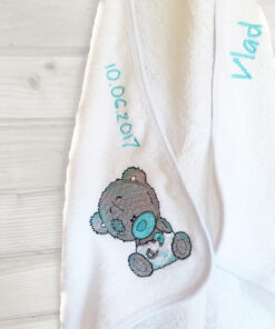 Sweet Baby Bear Towel este pufos si realizat 100% din bumbac. Prosopul are gluga si este personalizat prin broderie cu numele, data nasterii si un ursulet absolut delicios.